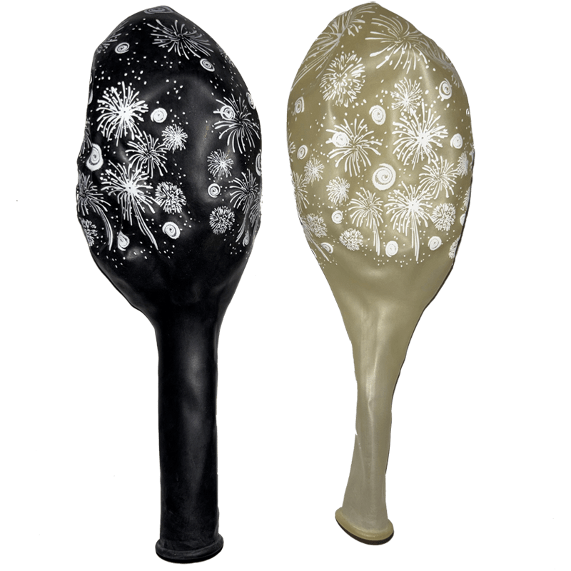 Rundballons der Marke Cattex (Premium-Line), Durchmesser 18 Zoll (43 cm) in transparentem Clear und gedecktem Black, mit weißem Rundumdruck “Fireworks (all-a-round)”